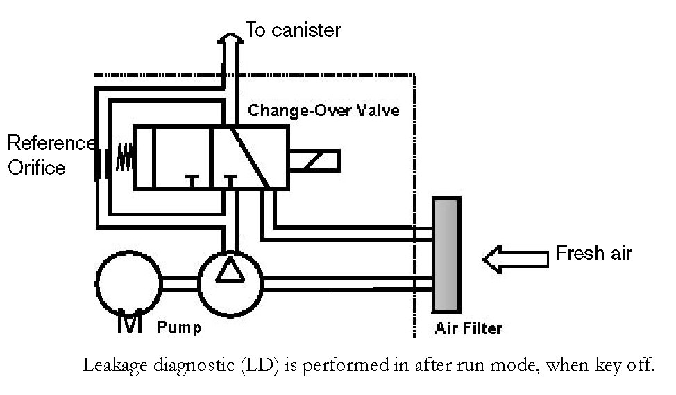 In this monitoring mode the changeover valve is switched over (the purge control valve remains closed). The motor current drops to a zero load level. Fresh air is now pumped through the canister into the tank. This creates a small overpressure at a tight evaporative system, which leads to a current increase.