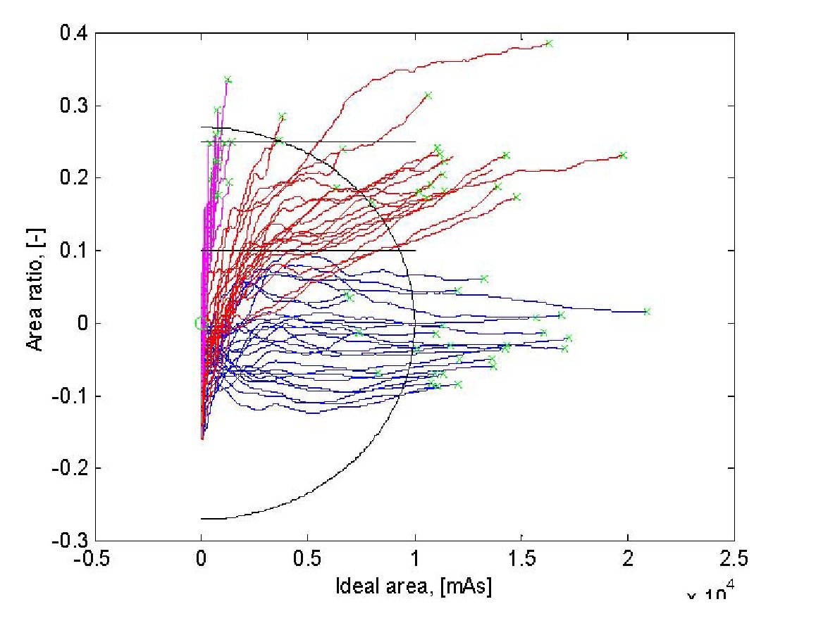 Results from simulation using old measurements and plotting the area ratio vs. the ideal area.Blue curves correlates to no leakage, red curves to 0.5 mm leakage and the magenta to 1.0 mm leakage.