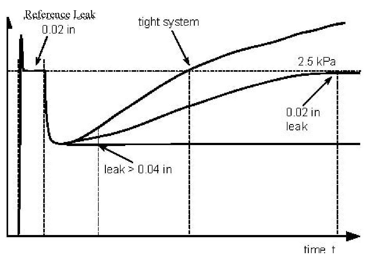 The rough leak check (≥0.04-inch) is performed by monitoring the pump motor current gradient. Relative pump motor current is created by using minimum pump motor current and reference pump motor current. Area ratio is created by dividing integrated relative current with ideal area, which is the linear integrated area from minimum pump current to current sample of the current. If the relative current has increased above an upper limit but not exceeded a calibrated area, within a calibrated time, the rough leak check has passed without a fault. If the calibrated area ratio is reached before the relative pump current limit, within the calibrated time, a rough leak fault code is set. The integrated relative pump current area A-int is defined by;