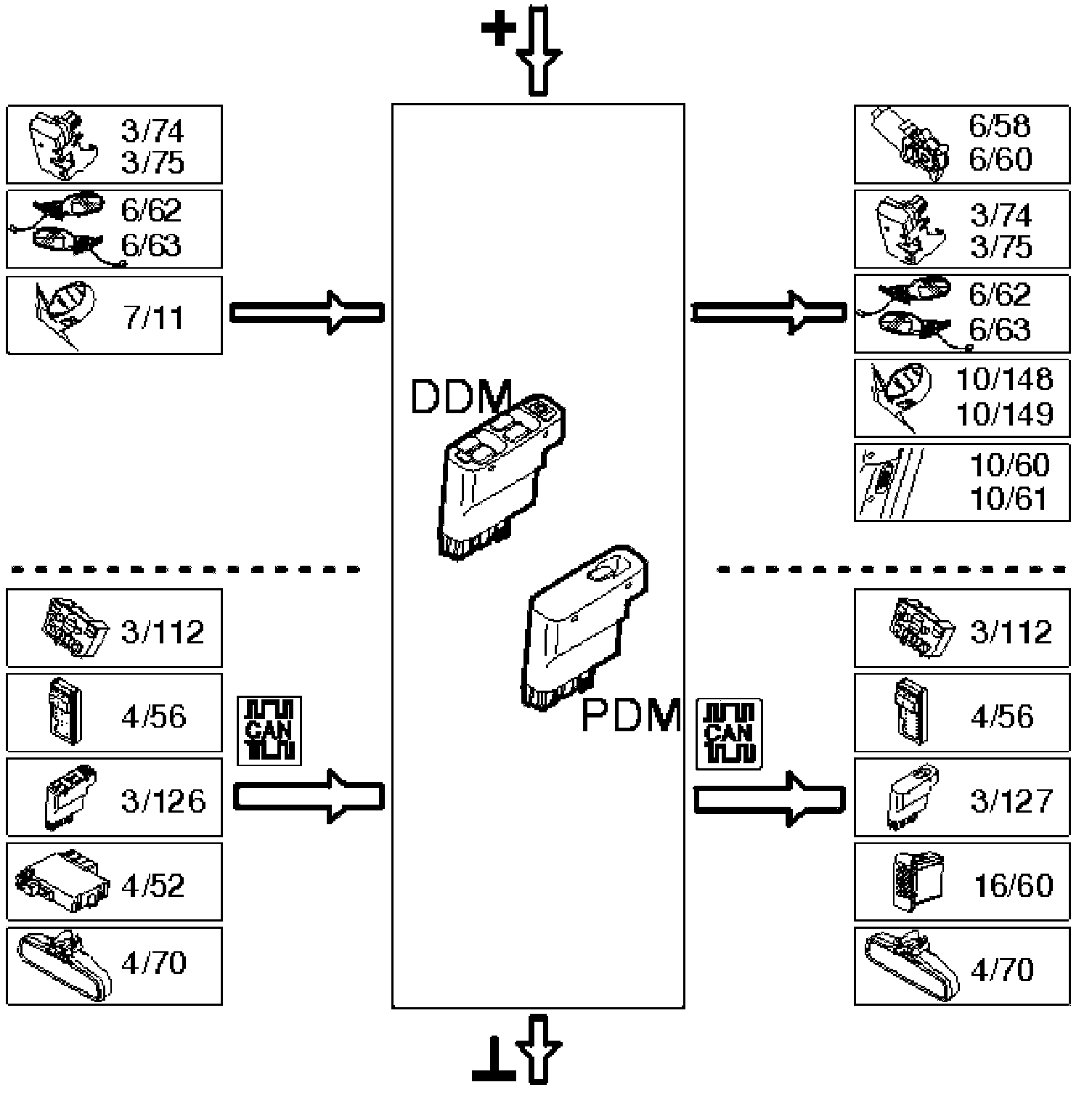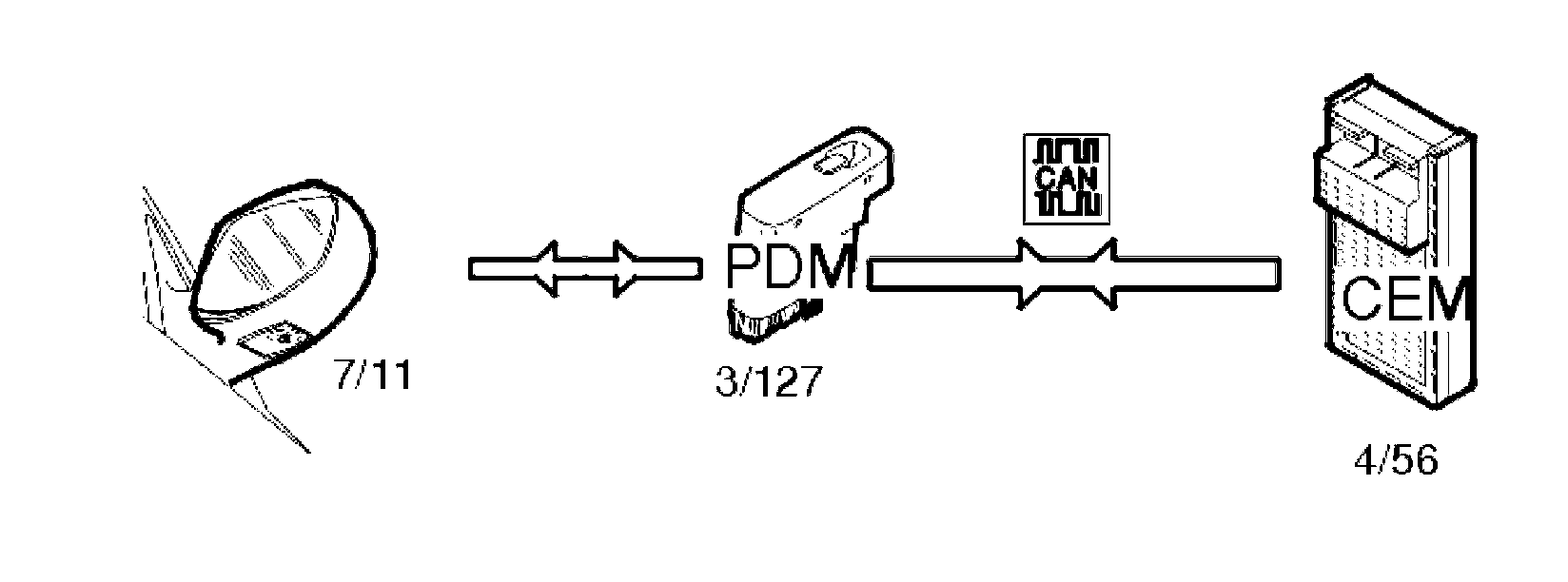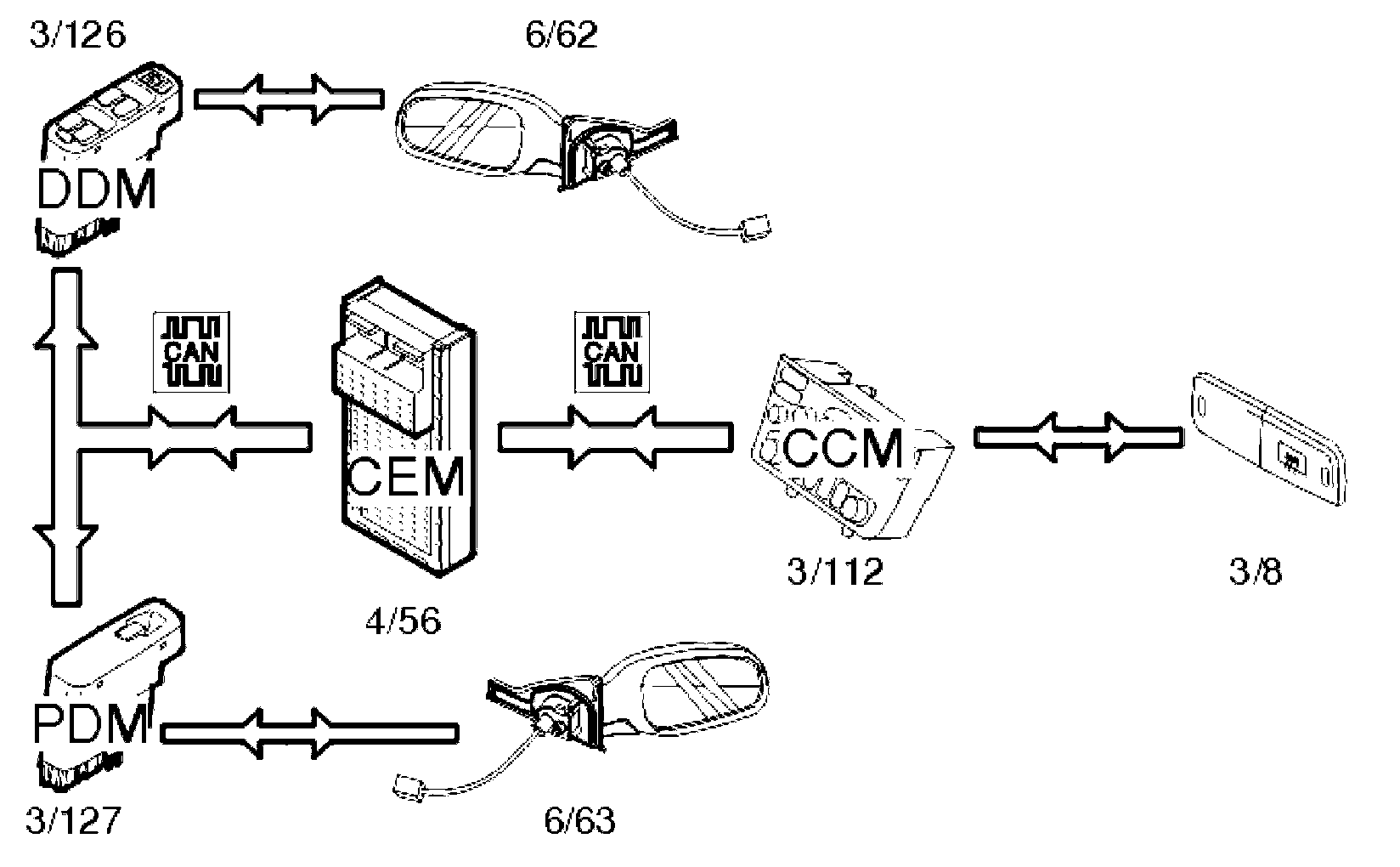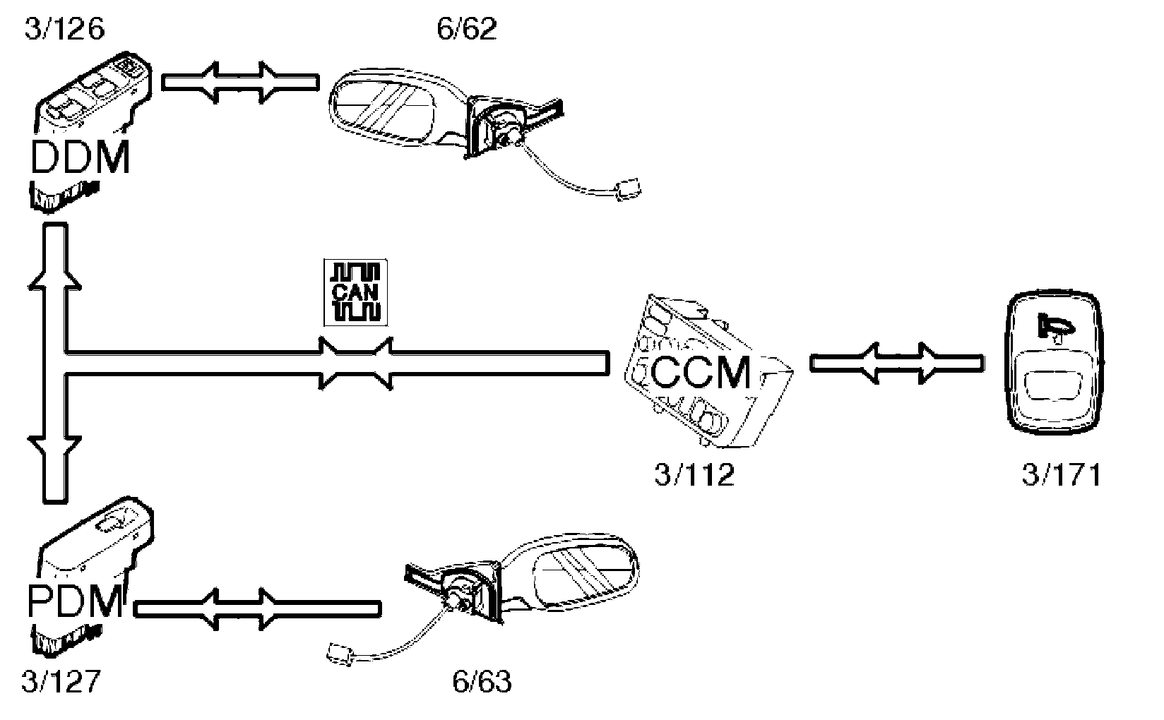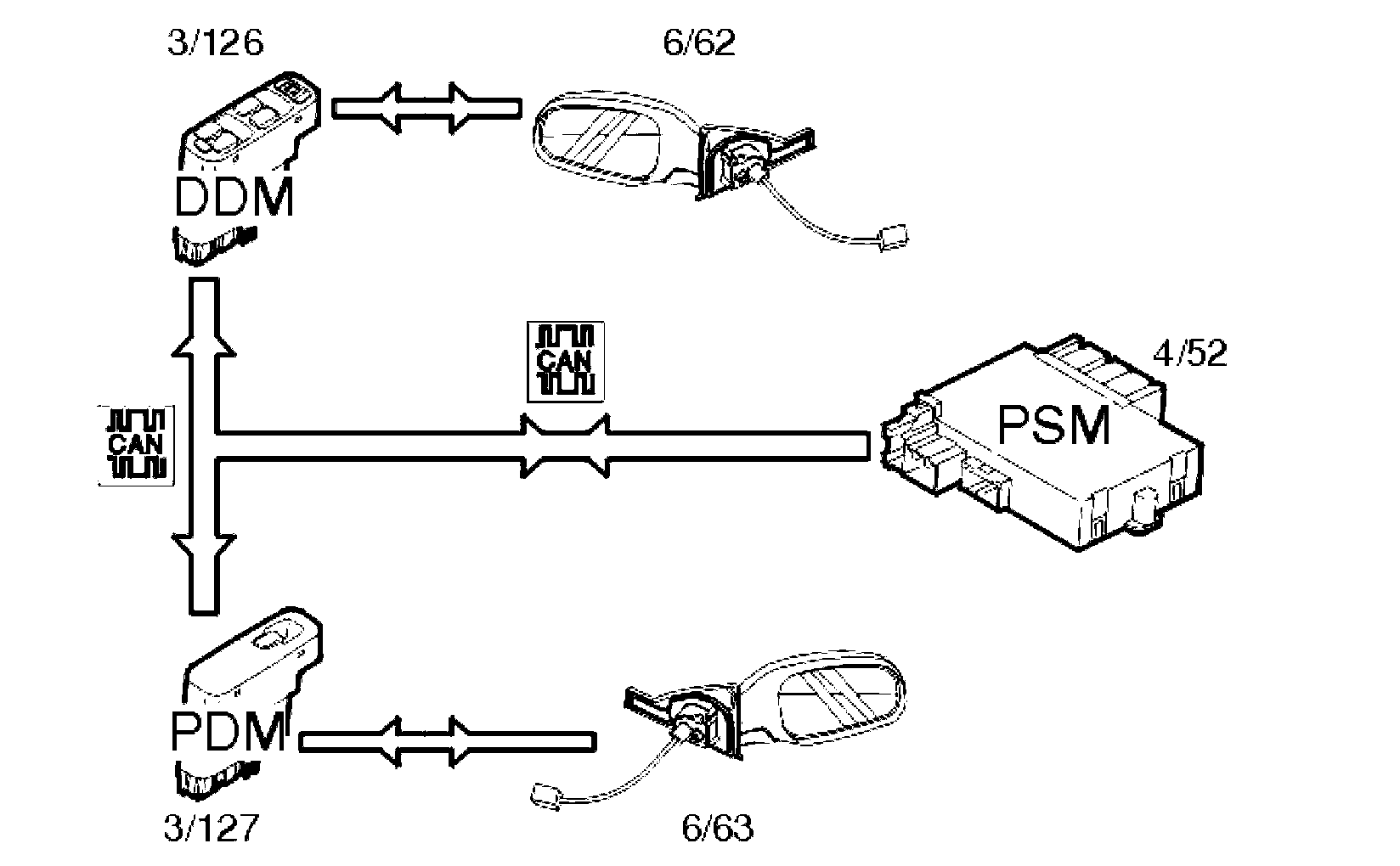 The position of the mirror is controlled using buttons on the driver door module (DDM) (3/126). The driver door module (DDM) transmits a signal directly to the mirror on the driver's side (6/62). When adjusting the mirror on the passenger side (6/63), a signal is transmitted from the driver door module (DDM) to the passenger door module (PDM) (3/127) on the Controller area network (CAN).