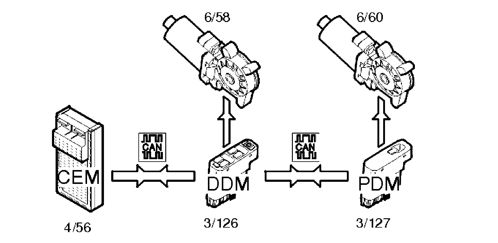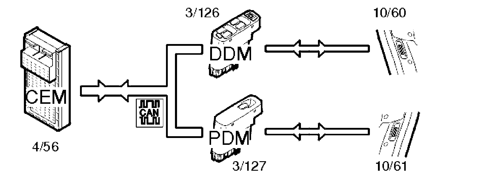Window control is activated via switches on the driver door module (DDM) (3/126) and passenger door module (PDM) (3/127). The motor for the power window on the driver's side (6/58) is controlled directly from the driver door module (DDM). The motor for the power window on the passenger side (6/60) is controlled via CAN communication from the driver door module (DDM) to the passenger door module (PDM). The signals for operating the rear windows are transmitted from the driver door module (DDM) via the controller area network (CAN) to the central electronic module (CEM) (4/56), which manages the rear window functions.