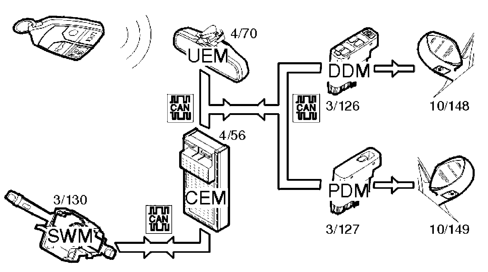 The guide lighting is activated using the left-hand control stalk (the key must be removed from the ignition switch). The steering wheel module (SWM) (3/130) then transmits a signal via the controller area network (CAN) to the central electronic module (CEM) (4/56). When the car is then locked, the central electronic module (CEM) sends a signal onwards via the controller area network to the driver door module (DDM) (3/126) and passenger door module (PDM) (3/127), which turn on the lights in the door mirrors (10/148 and 10/149). The lights are part of the guide lighting function and remain on for a set time (30, 60 or 90 seconds).
