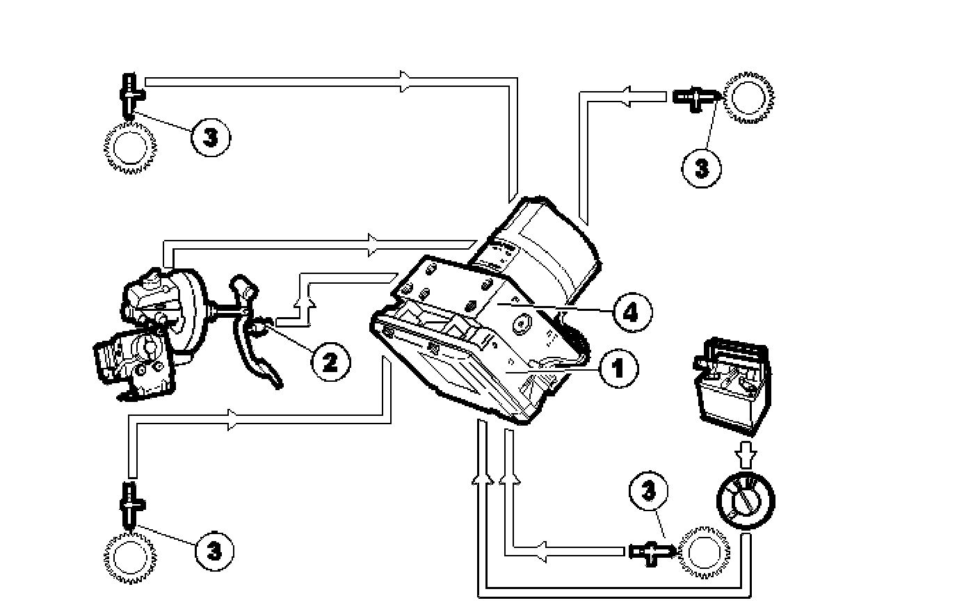 While driving, the brake control module (BCM) (1) registers the acceleration and deceleration of the wheels. The 4 wheel sensors (3) (one on each wheel) give the brake control module (BCM) information about the rotation speed of the wheels. The brake control module (BCM) calculates the speed of the car using this information and puts it out on the Control area network (CAN). There the signal is accessible for other systems.