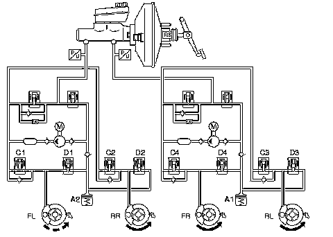 When a wheel locks-up under braking, the brake control module (BCM) begins to close the inlet valve for the relevant brake circuit so that the supply of brake fluid from the master cylinder is interrupted. This means that the hydraulic pressure cannot increase irrespective of the pressure in the master cylinder (constant pressure, see the right-hand front wheel - FR). The hydraulic pump starts at the same time.