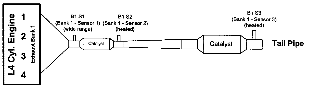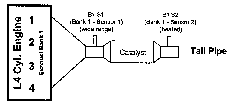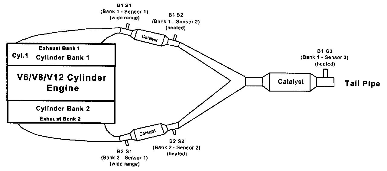 Oxygen Sensor and Catalyst Configuration ExampleV6/V8/V12 Engine W/2 Exhaust Banks & 4 Catalysts: