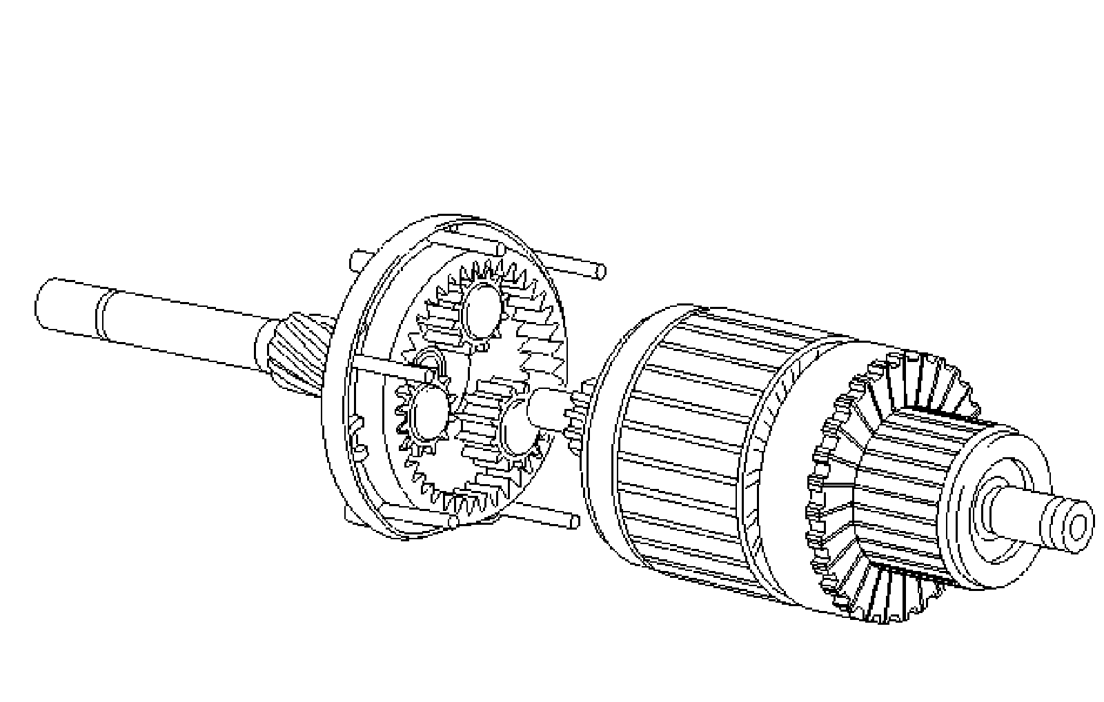 When the starter motor rotates, the sun wheel rotates clockwise. The planetary gears, which are constantly engaged with the sun wheel and ring wheel, rotate counter-clockwise. As the ring wheel is secured, the planetary gears are forced to circle around the sun wheel clockwise. The planetary gears rotate more slowly than the sun wheel. It is the clockwise rotation of the planetary gears which drives the pinion. The speed reduction that occurs between the sun gear and the planetary gear, results in greater torque. This means that a smaller and lighter starter motor can be used.