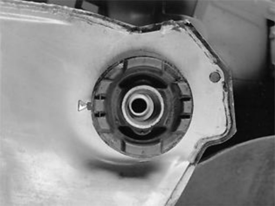 NOTE: The left-hand rear bushing on the subframe is a different version to the other three bushings. The hole in the center of the bushing is oval. The oval must be positioned lengthways to the car, as shown in the above figure.