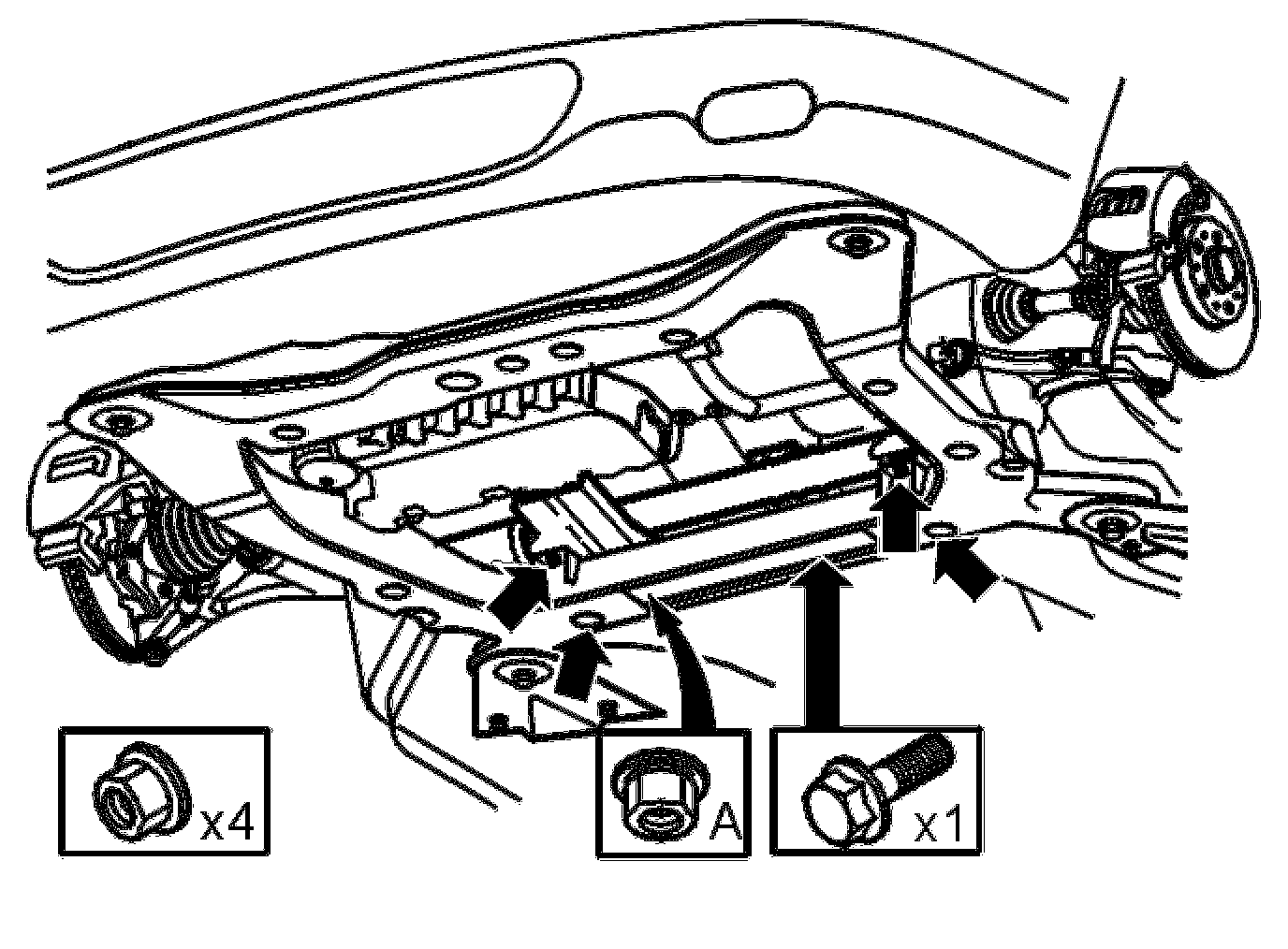 - Install the four screws for the sub-frame. Use new screws. Do not tighten yet.