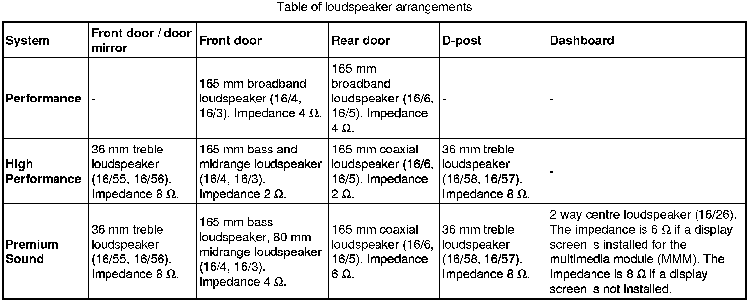 In some versions of the audio module (AUD), a treble speaker can be connected to the front and rear speakers. The treble speakers for the front loudspeakers are positioned in the front door at the same height as the door mirrors. For the rear loudspeakers, the treble speakers are positioned in the D-post.