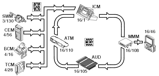 These commands are transmitted from the steering wheel module (SWM) (3/130) to the infotainment control module (ICM) (16/1) via the Controller area network (CAN). The infotainment control module (ICM) converts the electrical signal to an optical signal and sends it onwards to the multimedia module (MMM) (16/108) via the MOST network.