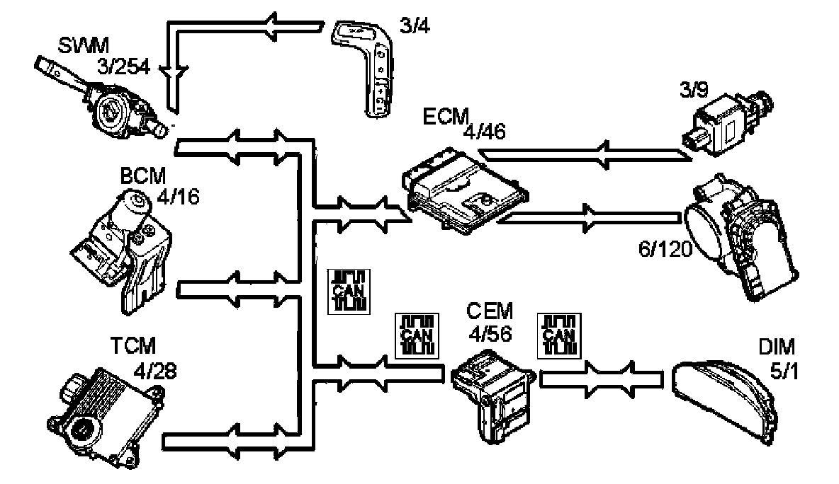 The driver activates the function by pressing the SET+ or SET- button. A message is then transmitted via the low speed side of the Controller area network (CAN) to the central electronic module (CEM) which then transmits the message on via the high speed side of the Controller area network (CAN) to the engine control module (ECM).
