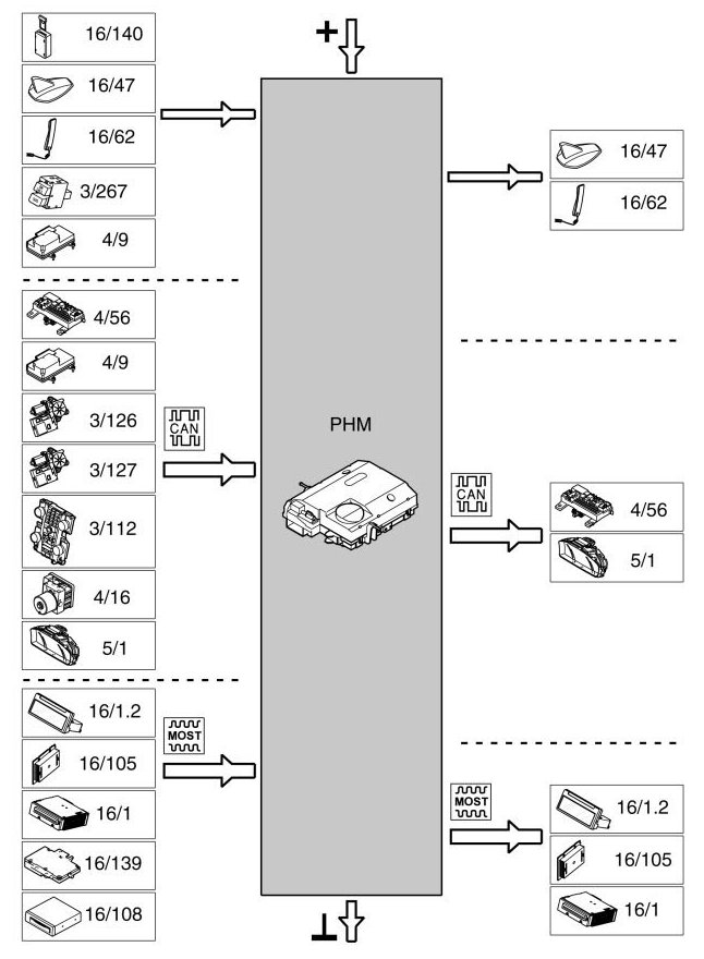 If the phone module (PHM) is not powered, there will be no MOST network communication and the system is switched off.
