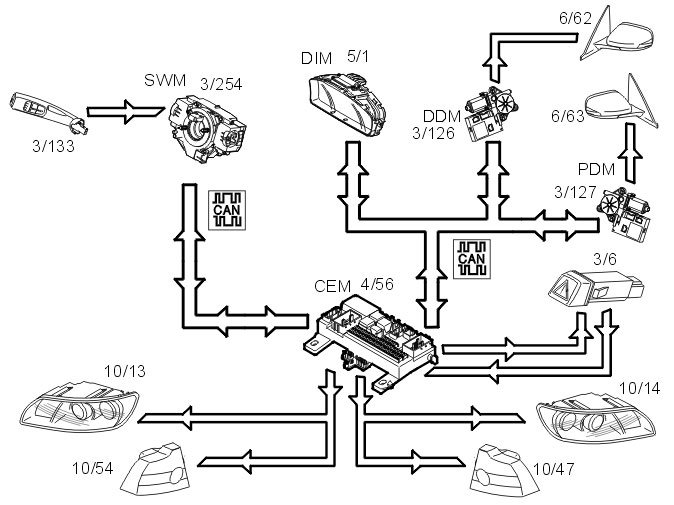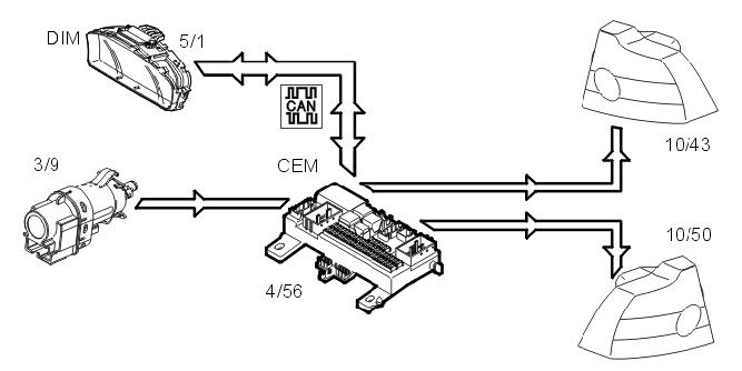 This function is controlled by the left control stalk (3/133). The steering wheel module (SWM) (3/254) sends signals via the control area network (CAN) to the central electronic module (CEM) (4/56) to activate the turn signal lamps (10/13-14 and 10/47-54).