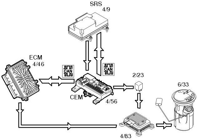 The central electronic module (CEM) (4/56) receives a request from the engine control module (ECM) (4/46) via the control area network (CAN) to start the fuel pump (FP). The central electronic module (CEM) then activates the relay (2/23) which supplies the fuel pump unit (4/83) with power, which in turn powers the fuel pump (FP) (6/33).