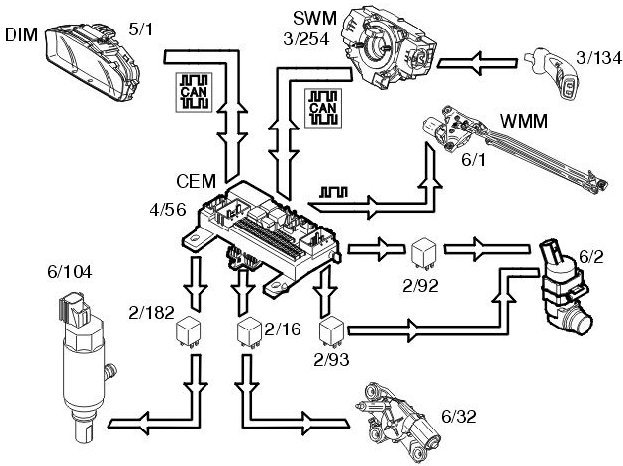 The right-hand control stalk (3/134) is moved downwards through three positions to operate the windshield wipers. The steering wheel module (SWM) (3/254) transmits information via the control area network (CAN) to the central electronic module (CEM) (4/56) about the selected position. The central electronic module (CEM) transmits the information on to the wiper motor module (WMM) (6/1) via serial communication.