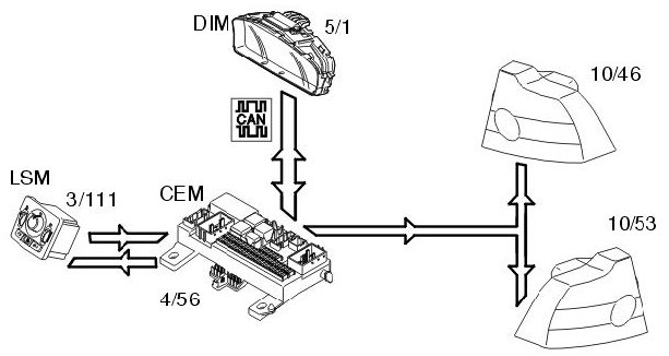 The central electronic module (CEM) (4/56) receives information from the light switch module (LSM) which is directly connected to activate the lamps.