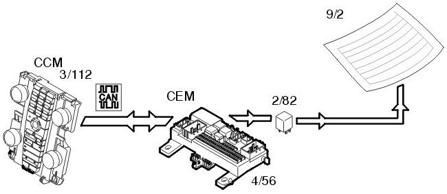 Rear demist (9/2) is activated by pressing the switch on the climate control module (CCM) (3/112). The climate control module (CCM) transmits the data via the Control area network (CAN) to the central electronic module (CEM) (4/56).