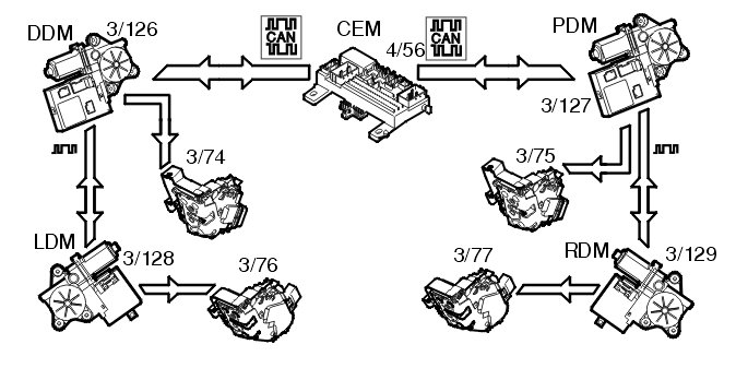 Child-proof locking involves an additional lock motor in each rear lock unit. The lock motor disengages the inner door handle on each rear door so that the door cannot be opened from the inside. The central electronic module (CEM) also deactivates the rear power window lift mechanisms. This function is activated using a button on the control panel in the driver's door. The control panel is directly connected to the driver door module (DDM). The button has an alternating function which engages or disengages the function every other time the button is pressed. The activation button has a built-in LED to indicate activated function. A message is also shown in the display in the driver information module (DIM).