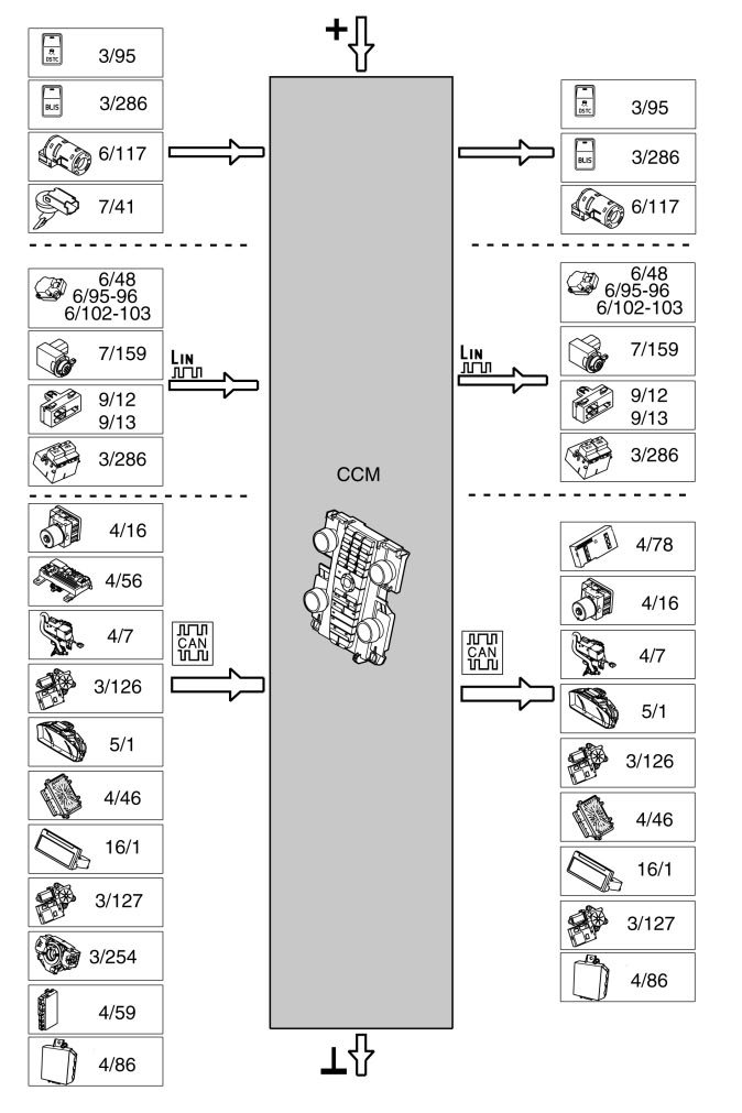 The number of components on the LIN buses varies, depending on the equipment level of the vehicle (ECC/MCC and any options) and whether the vehicle is left or right-hand drive.