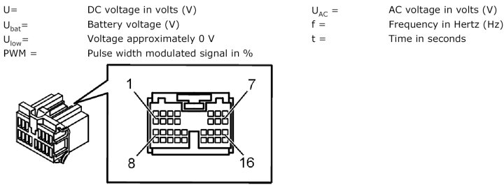 All the values given below are between the terminals stated in column 1 and terminal #A16 in column 2 (signal ground). This applies unless otherwise indicated in brackets.