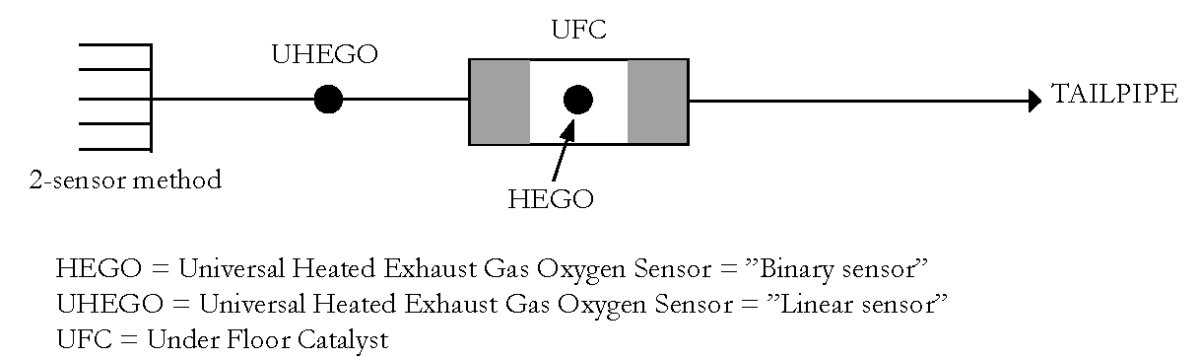 The two-sensor method makes use of one upstream and one downstream oxygen sensor, one sensor (UHEGO) before the catalytic converter and one sensor (HEGO) inserted into the catalytic converter, monitoring the front part of the catalyst.
