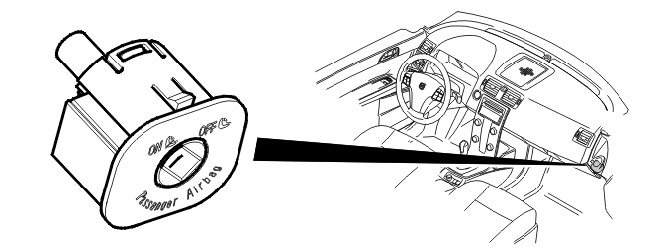 This switch is used to activate or deactivate the front passenger airbag. The switch is on the side of the dashboard on the passenger side. The switch can only be accessed with the front passenger door open. The ignition key is used to change the position of the switch. When the switch is in the "OFF" position, all the stages of the passenger airbag are deactivated and the passenger airbag disconnected (PAD) warning lamp lights.