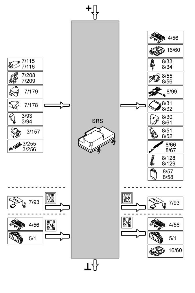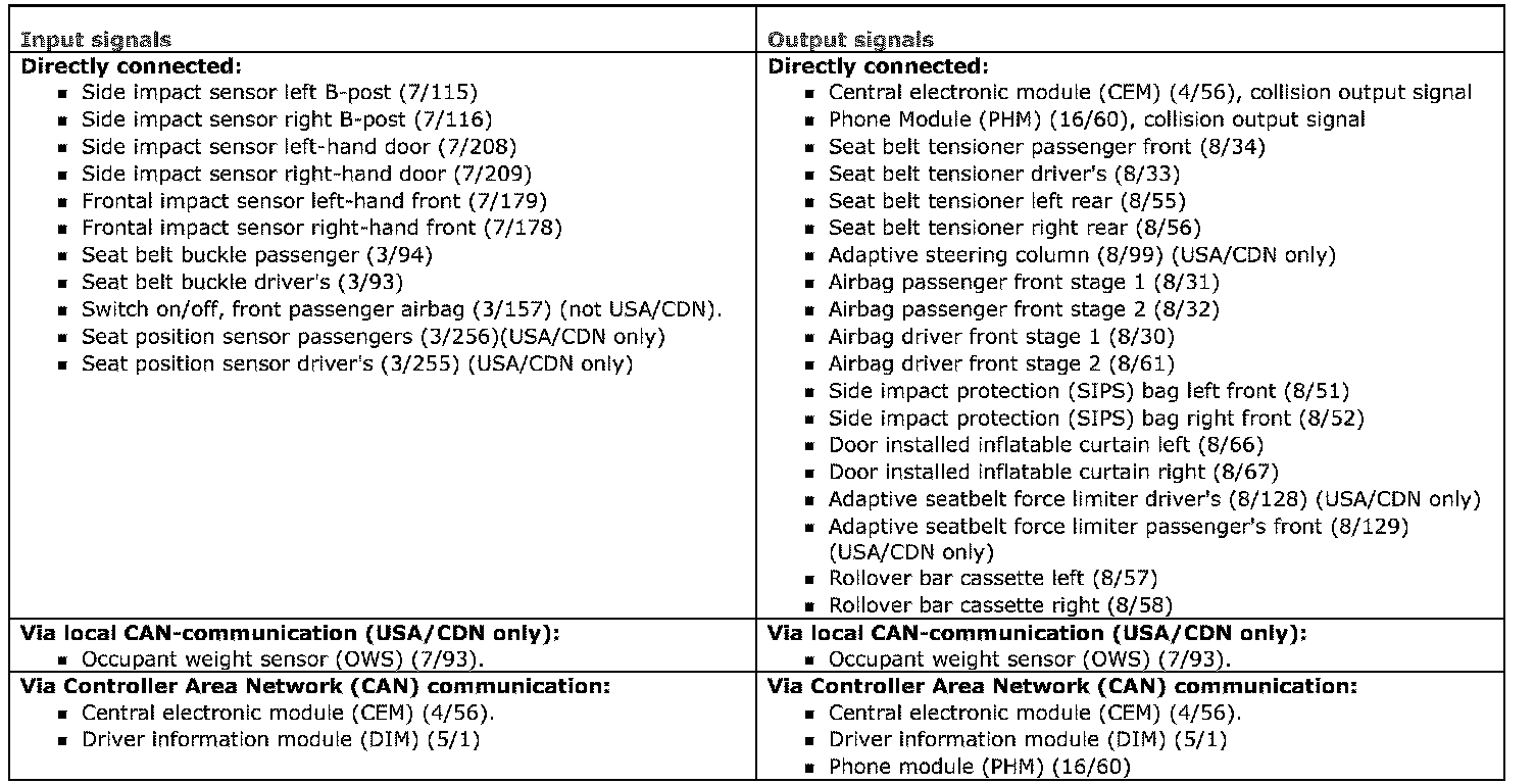 The table below summarizes the input signals to and output signals from the supplemental restraint system module (SRS). The signal types are divided into directly connected signals and CAN communication. The illustration below displays the same information with the Volvo component designations.