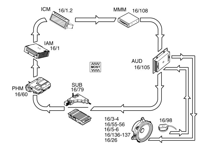 When sound compensation is required, the infotainment control module (ICM) transmits sound compensation signals via the MOST network to the audio module (AUD).
