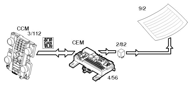 Rear demist (9/2) is activated by pressing the switch on the climate control module (CCM) (3/112). The climate control module (CCM) transmits the data via the Control area network (CAN) to the central electronic module (CEM) (4/56).