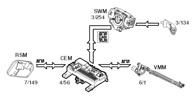 In the event of a fault, the central electronic module (CEM) transmits data via the Control area network (CAN) to the driver information module (DIM) (5/1) which displays a text message.