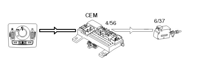 The switch for unlocking the fuel tank filler cover is in the light switch module (LSM). The switch and lock motor are directly connected to the central electronic module (CEM). If the switch is affected, the central electronic module (CEM) is grounded and powers the lock motor which begins to function. The lock motor has a spring-loaded piston which returns to its original position after a fully completed cycle. This means that the lock motor only needs to operate in one direction.