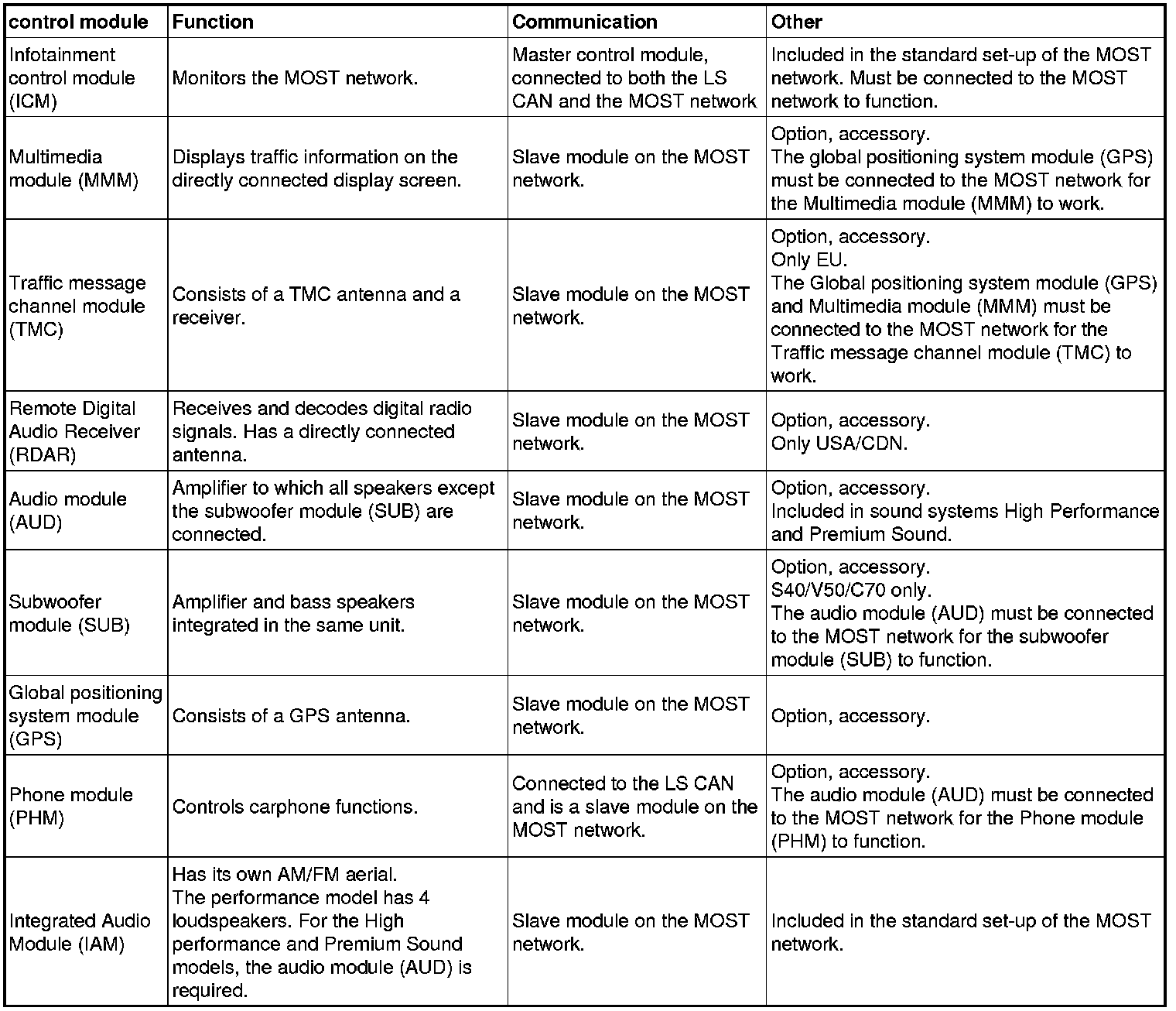 The infotainment control module (ICM) deals with monitoring and communication on the MOST network. The infotainment control module (ICM) is in turn monitored by the central electronic module (CEM) on the CAN network.