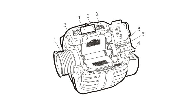 At the trailing edge, the alternator has an integrated welded-on charging regulator. For 5-cylinder engine, the charging regulator is also called Alternator control module (ACM). It is possible to change the regulator. On the regulator, bolted against the rotor's slip rings, there are brushes (carbon). The brushes can be changed separate from the regulator.