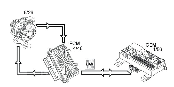 On 4 cylinder engines the charge regulator is connected to both the engine control module (ECM) and the battery. The engine control module (ECM) then communicates with the central electronic module (CEM) via the controller area network (CAN) to regulate the generator (GEN).