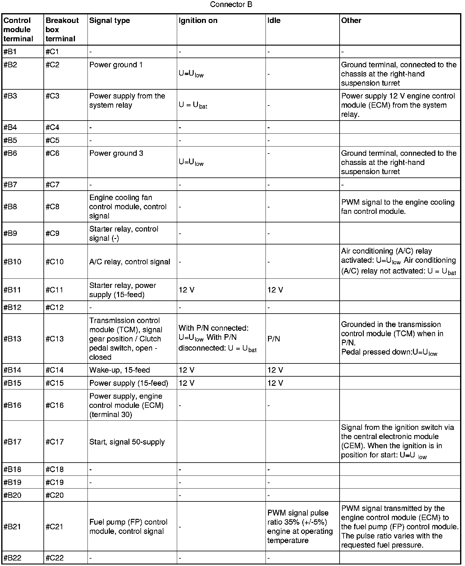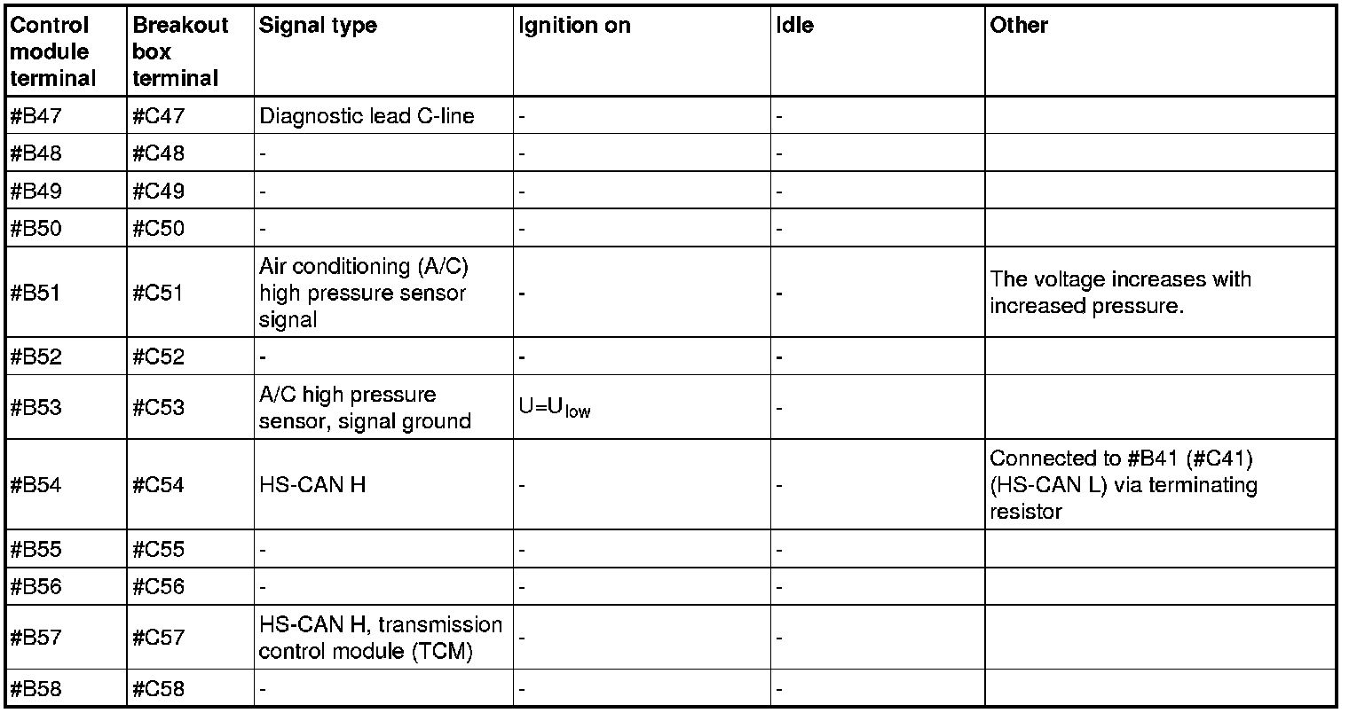 All values given below are between the terminals stated in column 1 and breakout box terminal in the terminal) and terminal #B1 (#C1) unless otherwise indicated in column 6 (Miscellaneous).