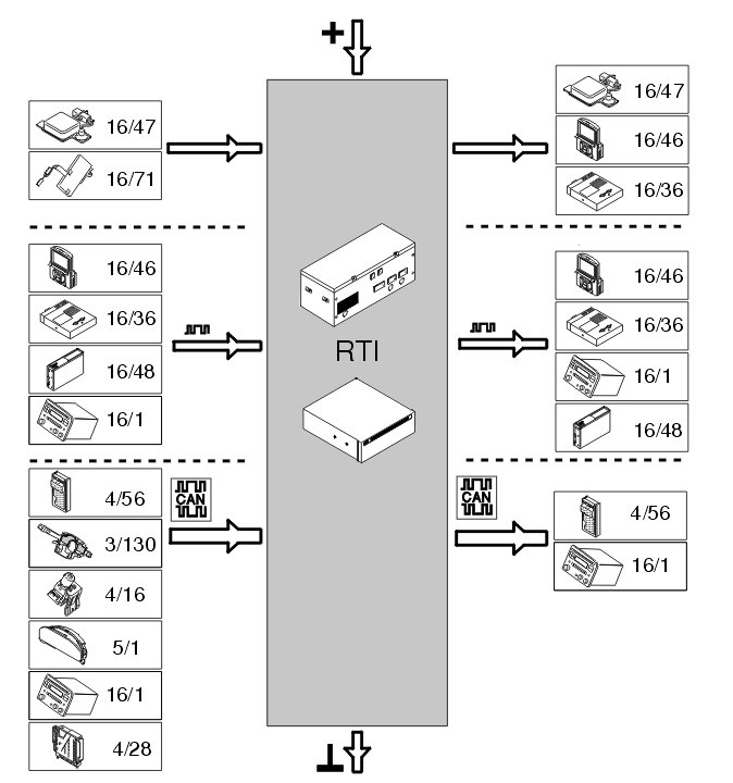 The RTI system communicates partly with components which are directly connected and partly with other control modules and components via serial communication and Control area network (CAN).