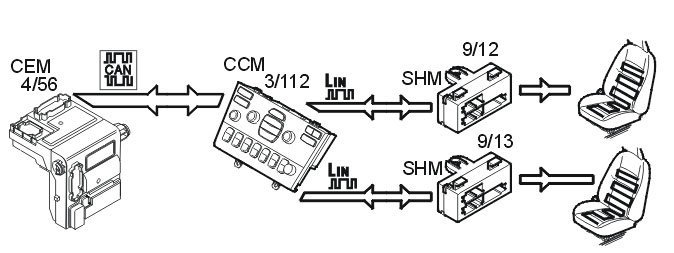 Communication between the climate control module (CCM) and each seat heating module (SHM) takes place in the following way: