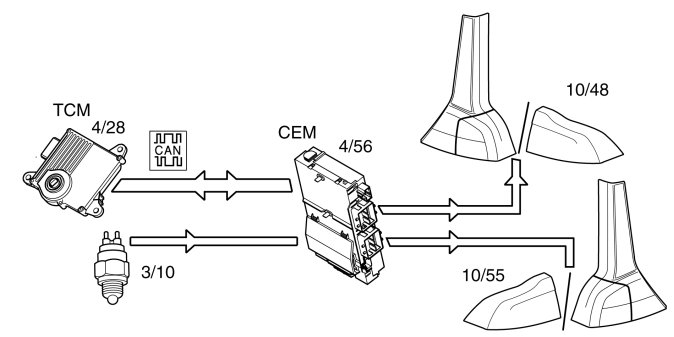 The reversing lights (10/48 and 10/55) are activated when reverse gear is engaged. The transmission control module (TCM) (4/28) informs the central electronic module (CEM) (4/56) that reverse gear is engaged via the CAN network. The central electronic module (CEM) powers the lights directly via an output.