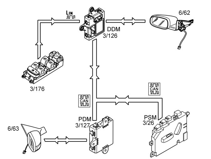 The power window motor on the driver's side is regulated directly by the driver door module (DDM) (3/126). The power window motor on the passenger side is regulated via CAN communication from the driver door module (DDM) to the passenger door module (PDM) (3/127). Signals for operation of the rear driver's side window is sent from the driver door module (DDM) to the rear window via LIN communication. Signals for operation of the rear passenger side window is sent from the driver door module (DDM) to the passenger door module (PDM) via the CAN network and then on to the rear window via LIN communication.