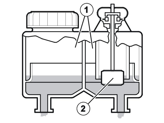 The reservoir contains a level function for detecting brake fluid loss in the brake system. The plastic float (2) floats on the brake fluid. This closes the connector on the switch when the brake fluid level drops below the MIN level on the reservoir. The stop (brake) warning lamp lights on the driver information module (DIM). The float and the switch are integrated with the container and cannot be replaced.