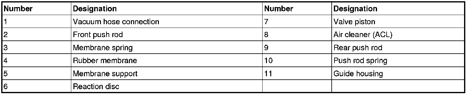 When the brake pedal is pressed down, the rear push rod and the valve piston are moved to the left (forwards). The valve spring causes the valve plate to follow until it reaches the seat in the guide housing. The connection between the front and reverse of the membrane is closed. As the piston continues to move forward, its movement is transferred via the reaction disc and the front push rod to the brake fluid in the master cylinder.