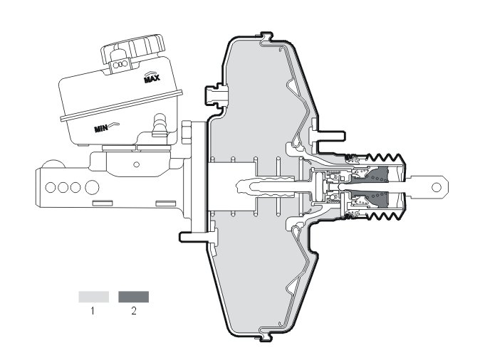 The membrane is installed on the guide housing, which therefore follows the movement of the valve piston. The guide housing force is transferred to the front push rod through the outer part of the reaction disc. Along with the force from the brake pedal, which presses on the inner part of the reaction disc, the front push rod presses the brake fluid out of the master cylinder to the wheel brakes. The vehicle is braked.