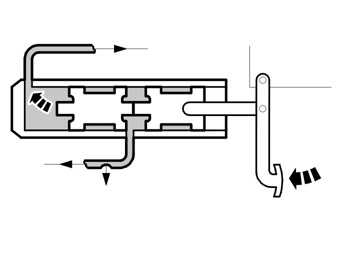 When the driver presses the brake pedal, the valve piston moves to the left as illustrated. The seat for the valve piston leaves the valve plate and the connection opens between the reverse of the membrane and the center of the valve assembly (which is at atmospheric pressure). Air at atmospheric pressure flows in behind the membrane. There is negative pressure on the front of the membrane. A difference in pressure is built up. The difference in pressure generates a force on the membrane, causing the membrane to move to the left as illustrated.