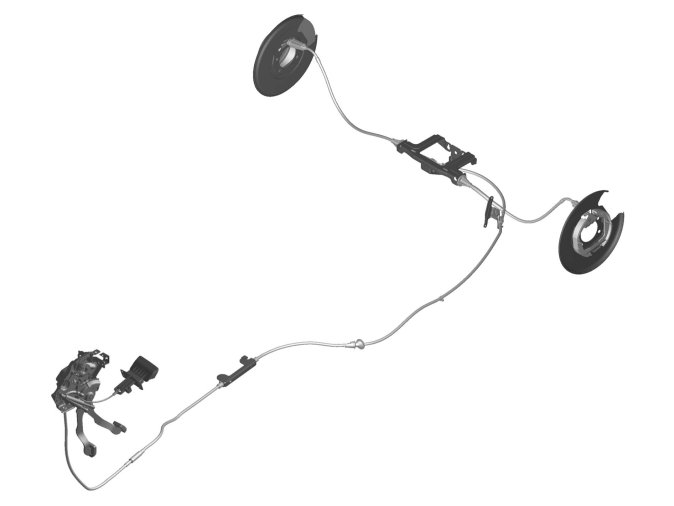 Two cables run from the master cylinder (3) to the brake control module (BCM) (4), where the brake pipes then branch to the wheel brakes.