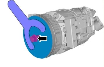 Slacken the tensioner.Use: 19 mm fixed wrench. Lock the tensioner in the slackened position. Use: 3 mm pin.