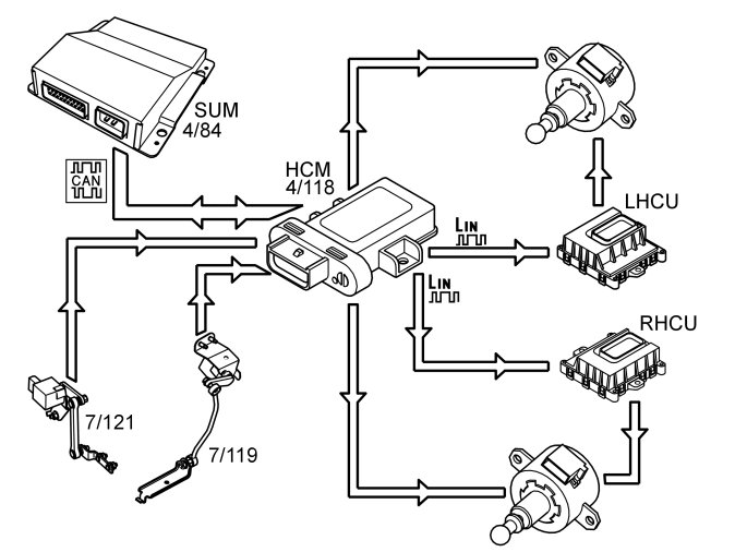 For vehicles with active headlamps, the headlamp control module (HCM) transmits information on the actual angle to the left headlamp control unit (LHCU) and right headlamp control unit (RHCU) via serial communication. The adjustment motors are then controlled by the left headlamp control unit (LHCU) or right headlamp control unit (RHCU), respectively, via an analog signal.