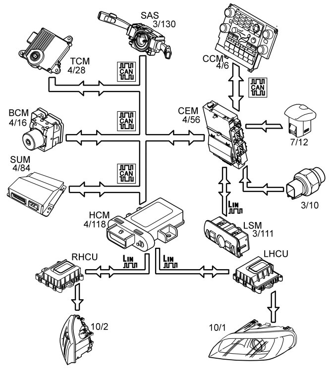 For the active headlamp function to be enabled, the headlamp control module (HCM) (4/118) requires information on the following: vehicle speed, current gear, light conditions and steering angle.