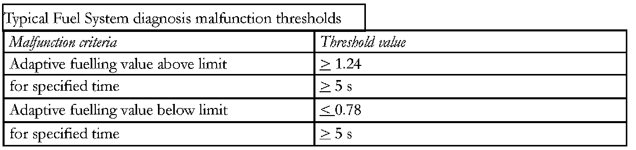 The fuel system diagnosis monitor the long term fuel trim adaptations, to check if any of the adaption points has reached it's limits (rich or lean), and no more adaption is possible. This will not immediately lead to higher emissions, because the short-term fuel trim can take care of additional faults. The long term fuel trim is calculated from the front linear oxygen sensor, and there are 6 times 6 (depending on load and engine speed) different adaptation points. Each point is monitored in order to check if it is higher/lower than the threshold value.