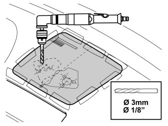 - Choose LHD or RHD on the drilling template and carefully predrill the holes according to the template using a -3 mm (1/8") drill bit. Continue to drill through the console to the loudspeaker located 15 mm (19/32") behind the grille.