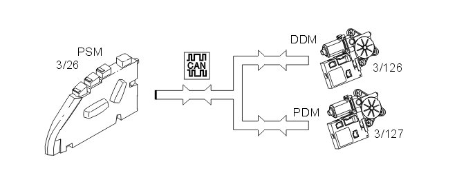 The vehicle has door mirrors with memory. When the desired memory button is pressed, the mirrors are set to the programmed position. Information is sent from the power seat module (3/26) to the passenger door module (PDM) (3/127) and driver door module (DDM) (3/126) to set the door mirrors to the programmed position. The memory position of the door mirrors are stored in the driver door module (DDM) and the passenger door module (PDM). The door mirror position stored is the position of the mirrors when the seat position was programmed. The position of the door mirror on the driver's side is stored in the driver door module (DDM). The position of the door mirror on the passenger side is stored in the passenger door module (PDM).